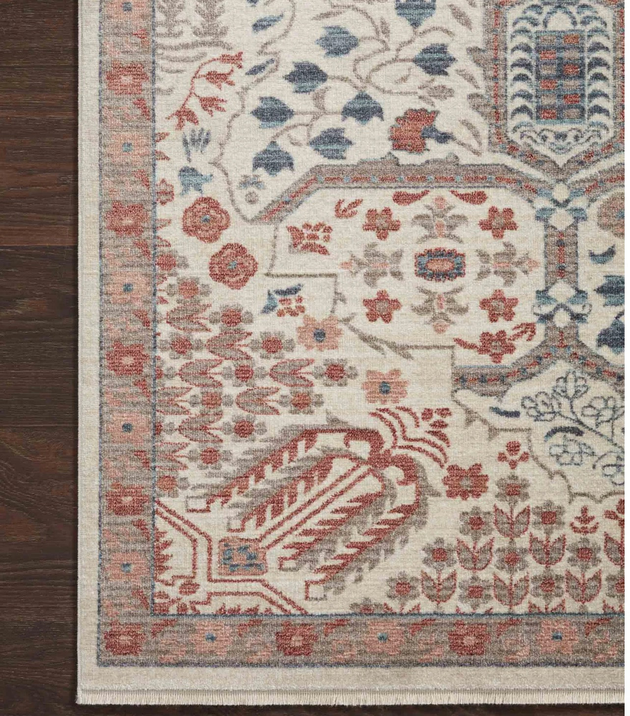 Our Isa rug features a motif that balances botanical elements and geometric shapes, accented with red, blush, and blue details. Powerloomed in Turkey, it has a soft, shed-resistant file that is both fade and stain resistant. Part of our Rifle Paper Co. × Loloi collection. The layout and scale of our rugs is adjusted to accommodate each available size, and may be different than what is pictured here. Images of each size are available by hovering over the desired size on our desktop site.