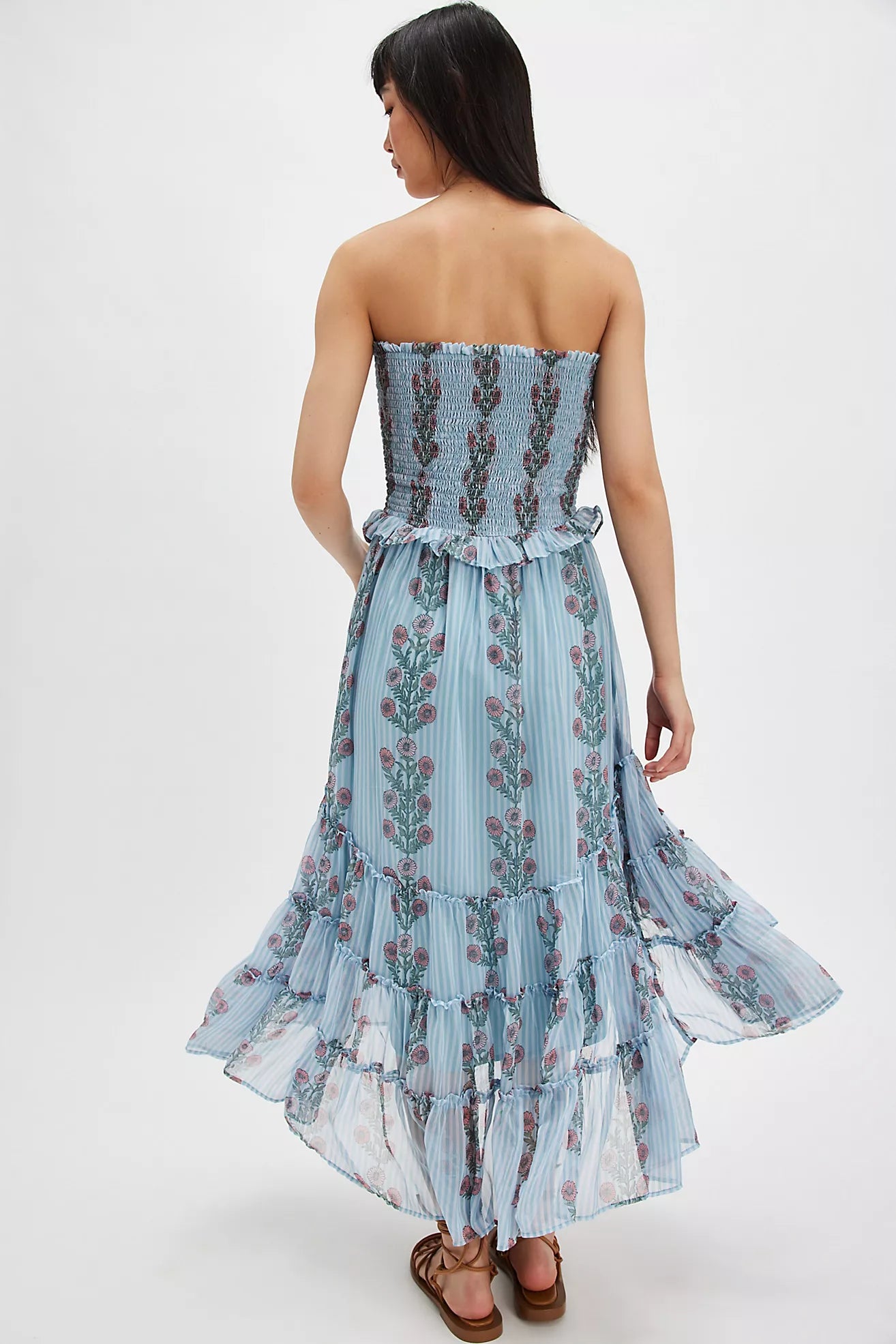 Fit: Slim through the bodice with high-low skirt design Features: Shirred bodice, dropped-waist seam, tiered skirt design, vintage-inspired floral block print throughout, removable straps Why We ❤ It: Easy with beachy sandals or sleek with platforms, this style has endless ways to wear.