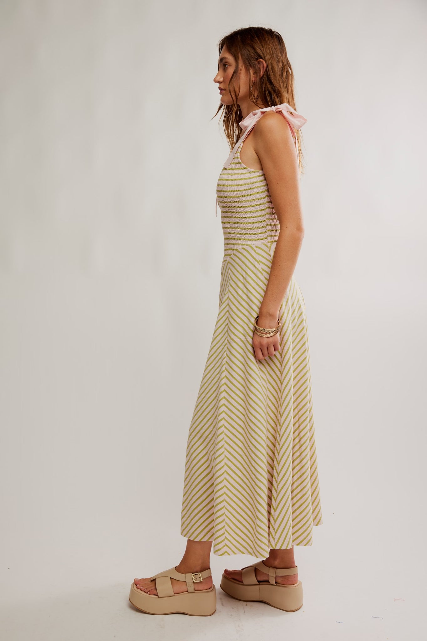 Flattering smocking and shoulder bow details make this drop-waist midi dress from free-est an easy, effortless option.