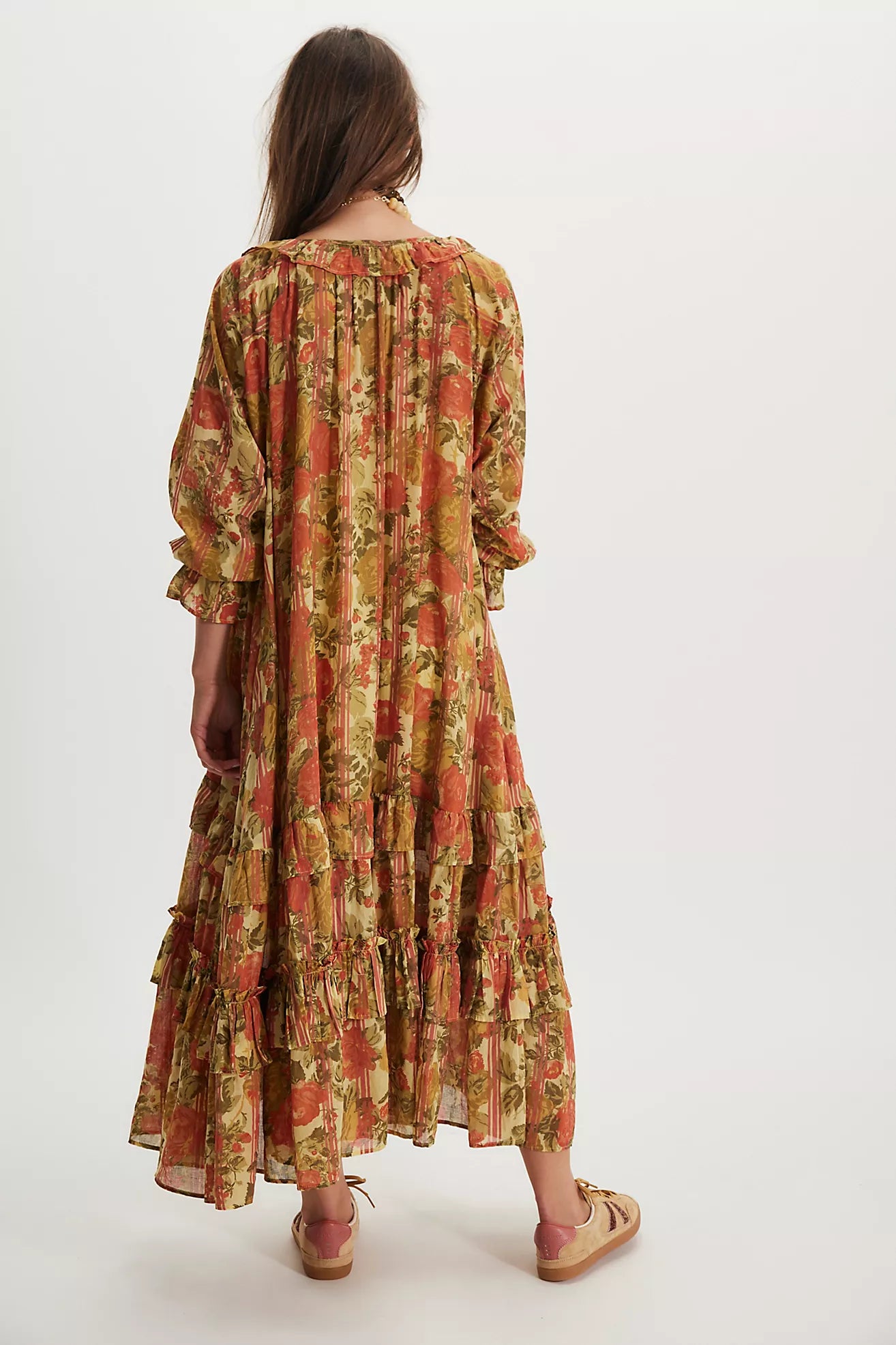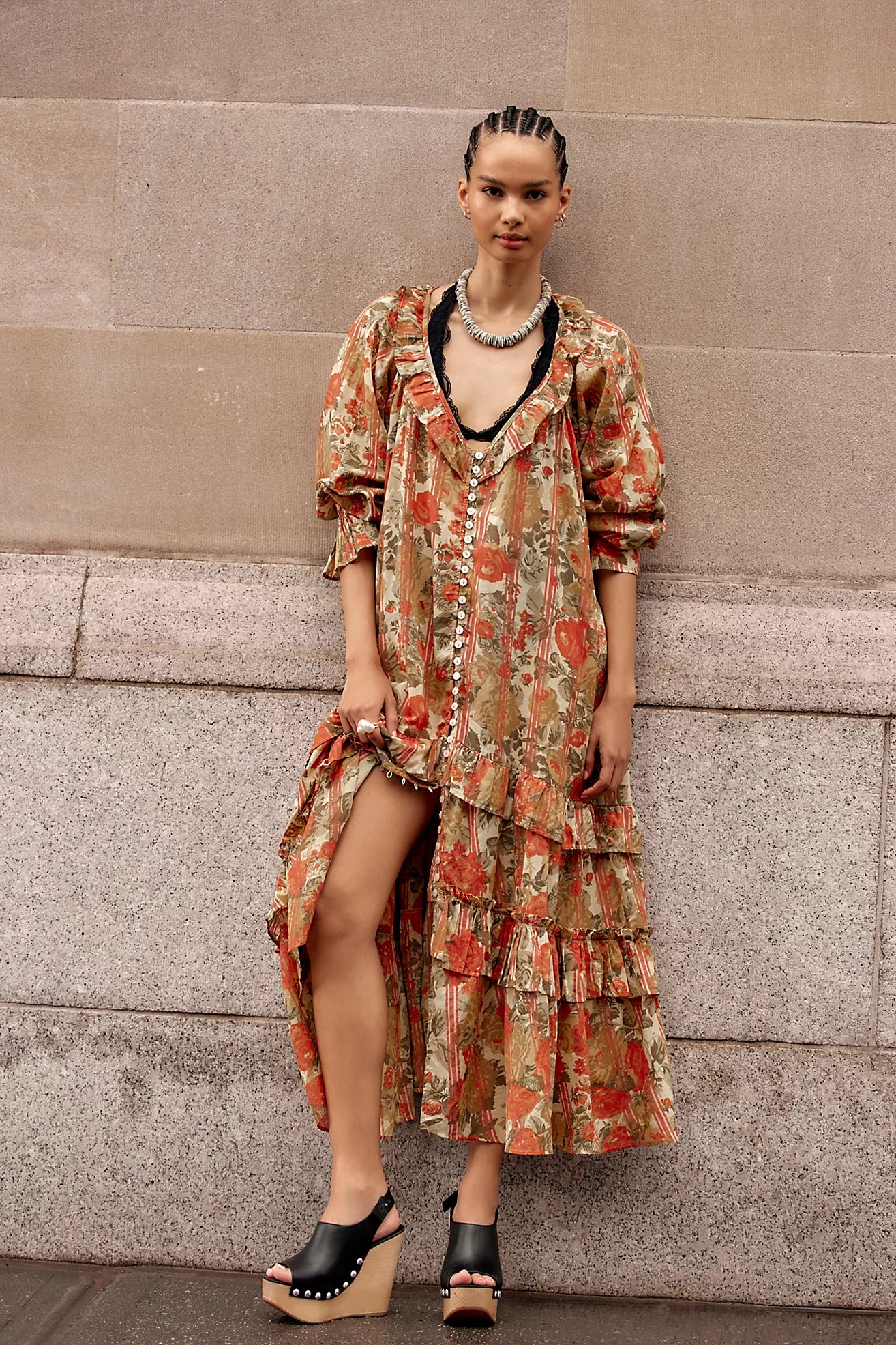 Just as effortless as it is essential, this versatile maxi dress is featured in a button-front silhouette with exaggerated sleeves and ruffled trims for the perfect femme finish.