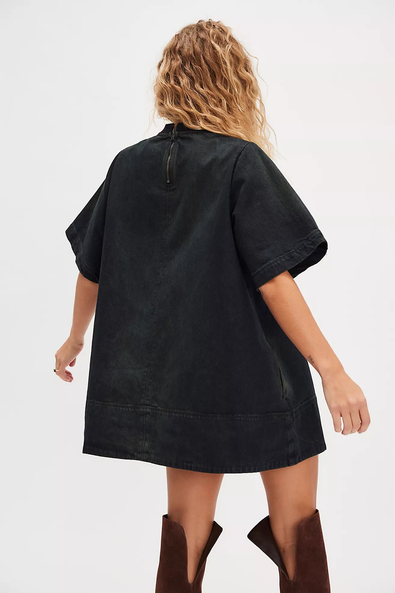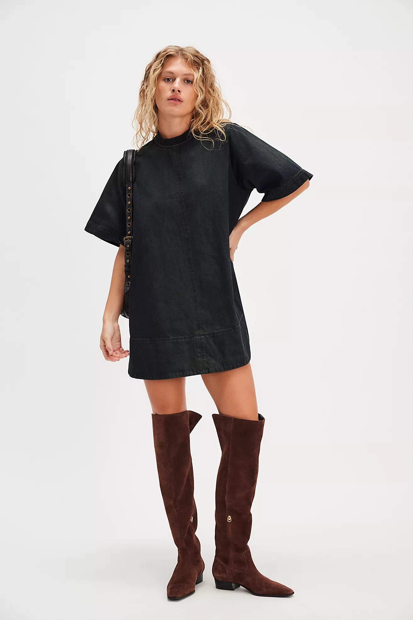 Effortlessly easy and perfect for everyday, this mini is featured in a soft denim fabrication and shapeless silhouette with a crew-neckline and relaxed short-sleeves.