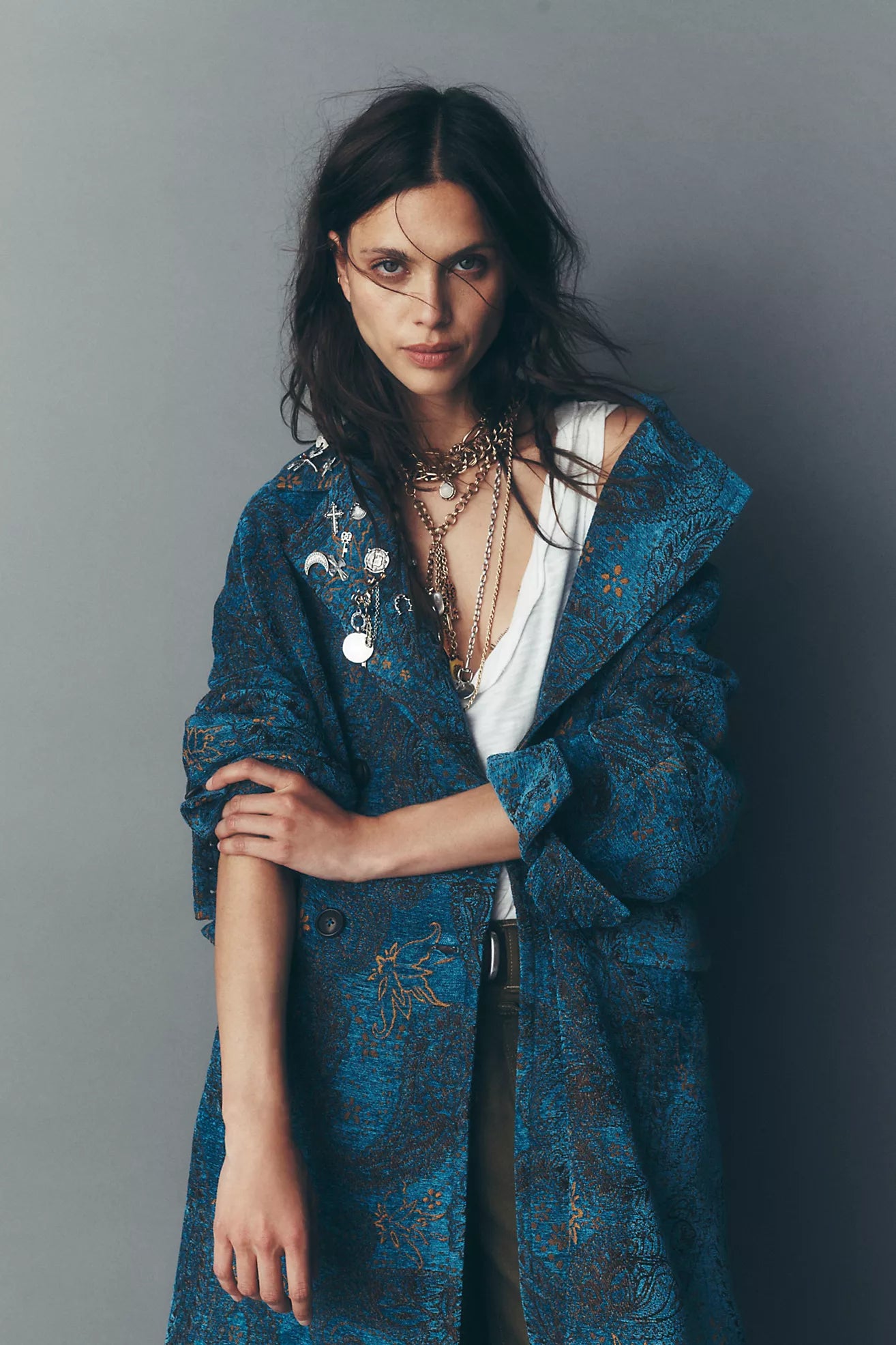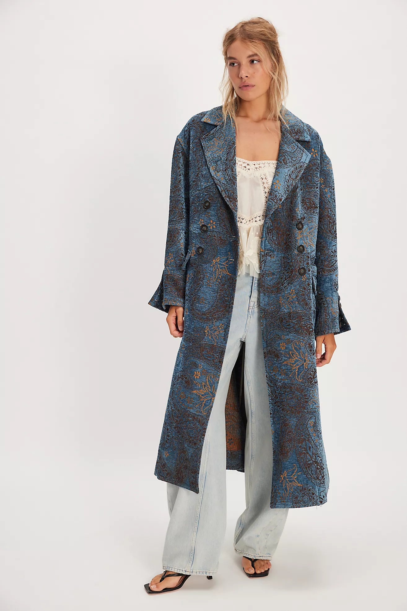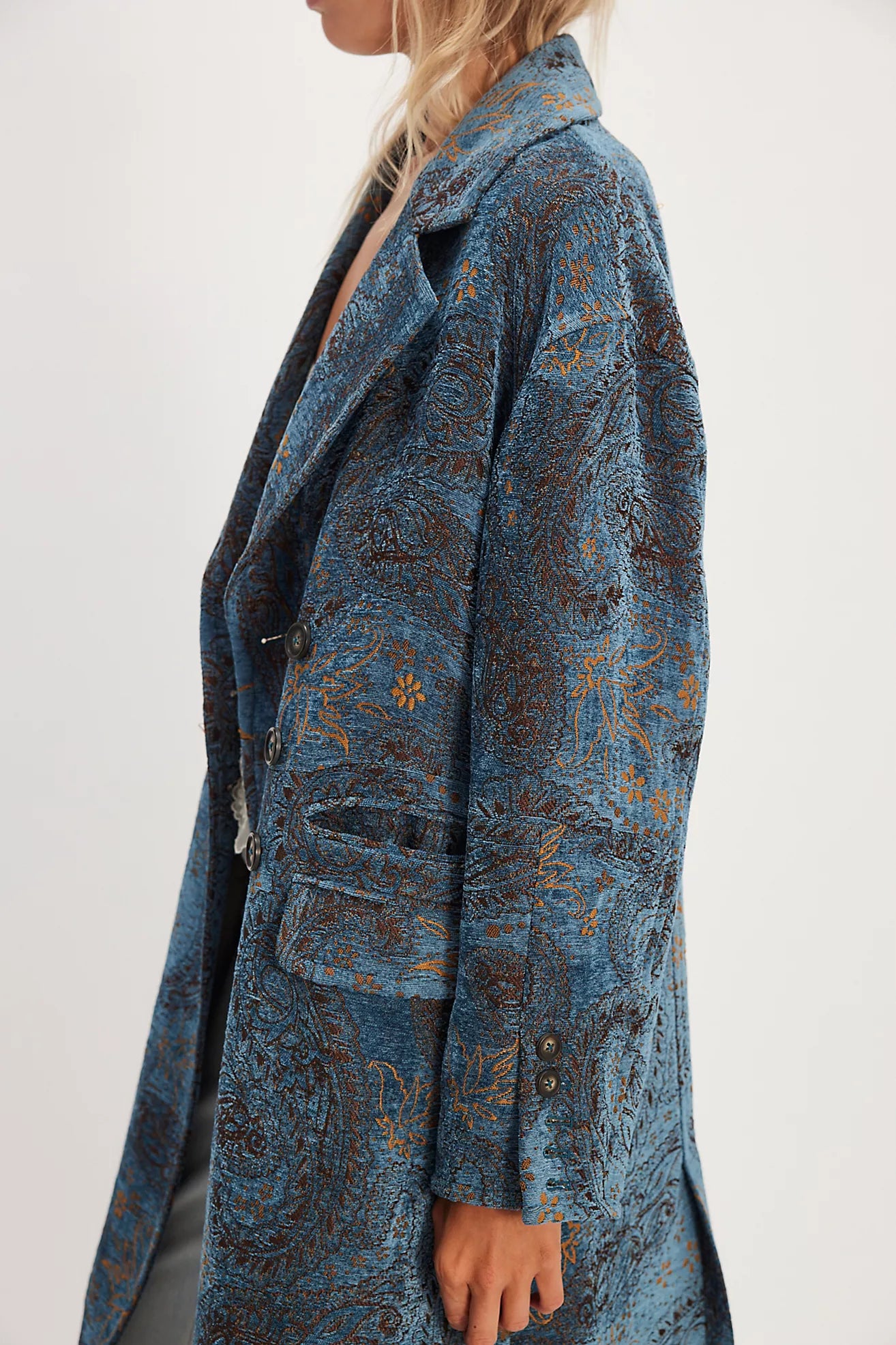 Add a statement last layer to your look with this duster, featured in a jacquard fabrication and classic double-breasted style for that sleek finish.