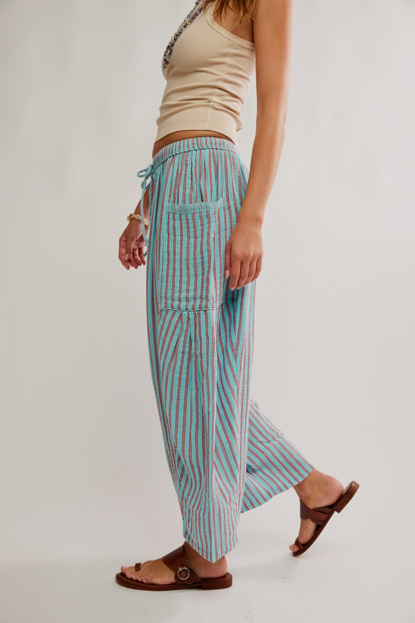 Features: Elastic waist for pull-on ease, drawstring feature, dropped side pockets, yarn-dyed striped fabrication