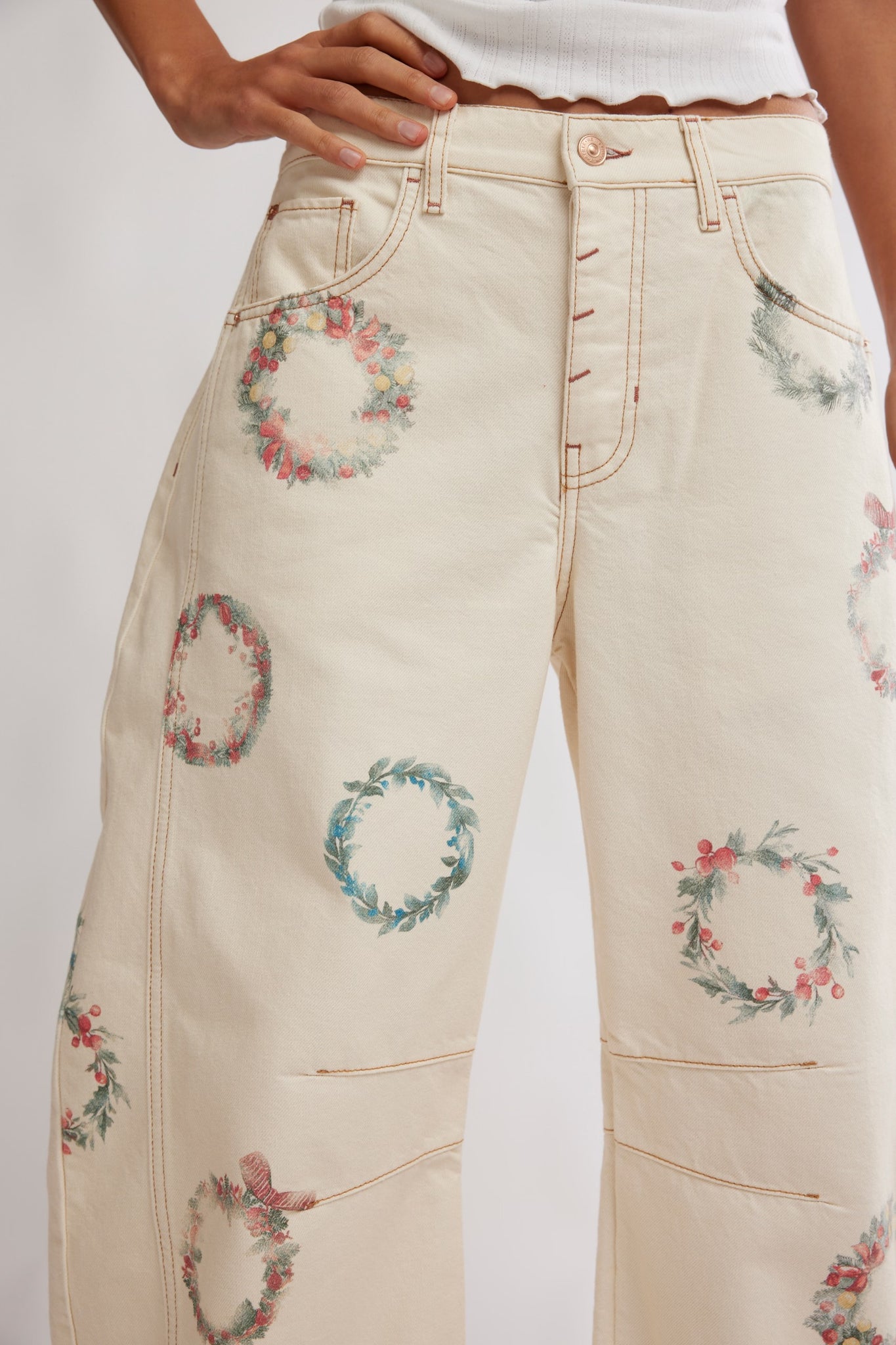 Free People We The Free Good Luck Printed Barrel Jeans/Watercolour Wreath