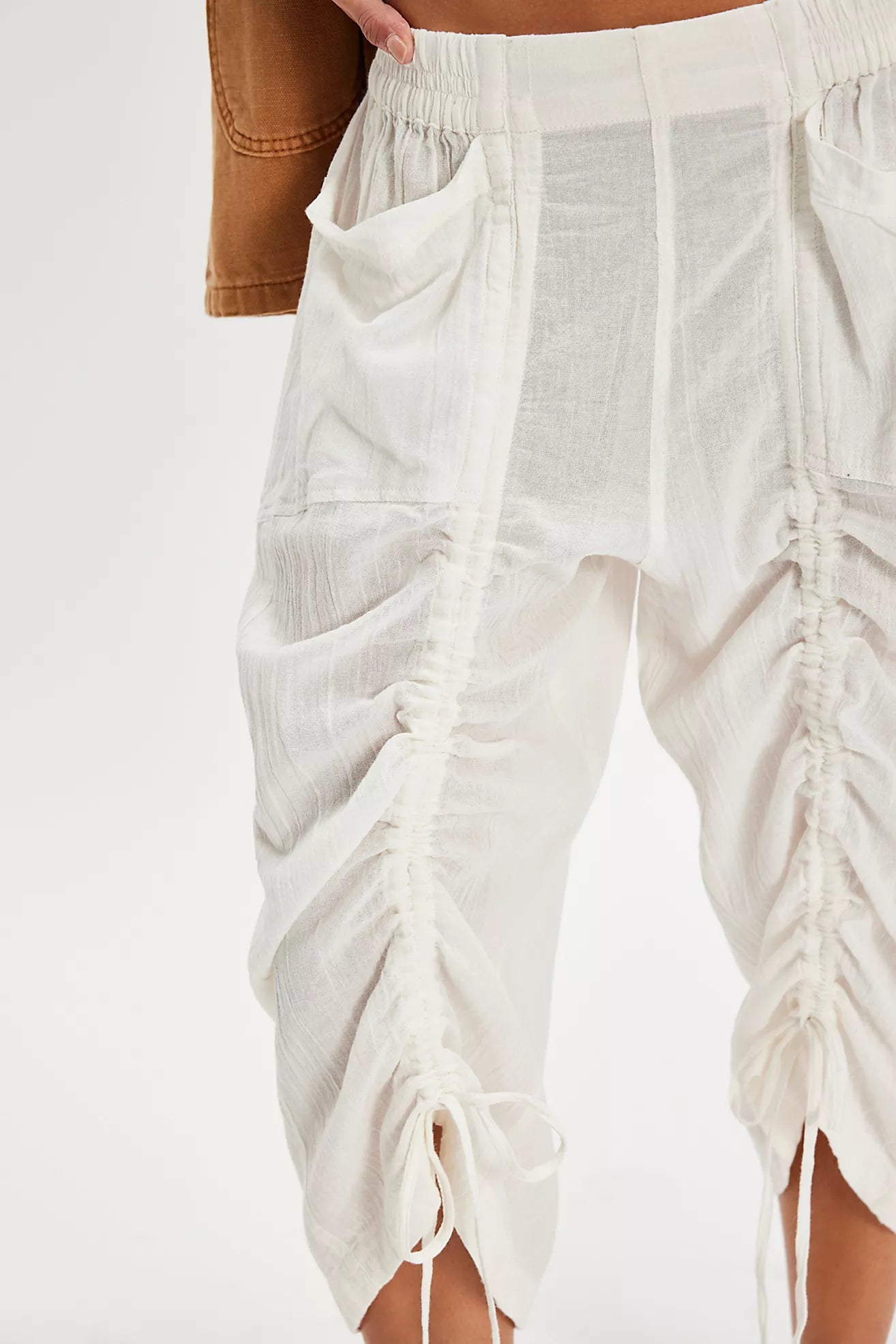 Features: Elastic waistband for pull-on ease, dropped side pockets, cinched tie detail, breezy cotton fabrication